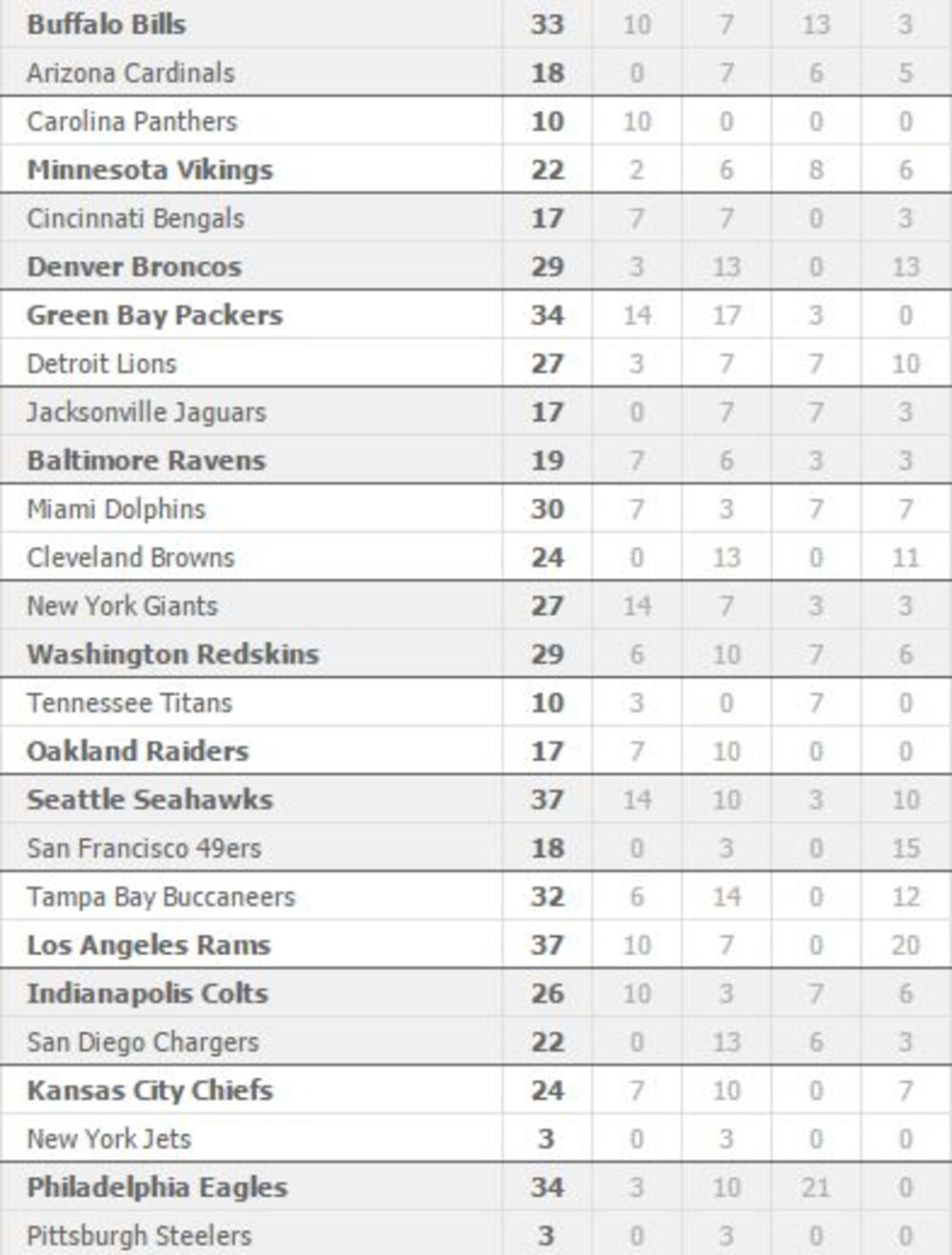 Trebalo bi još izdvojiti pobedu Grin Beja protiv Detroita 34:27 (briljirao Eron Rodžers sa 4 bačena tačdauna, kao i sjajnu partiju Edi Lejsija), kao i trijumf Sijetla protiv San Franciska 37:18 (Rasel Vilson bacio 215 jardi).