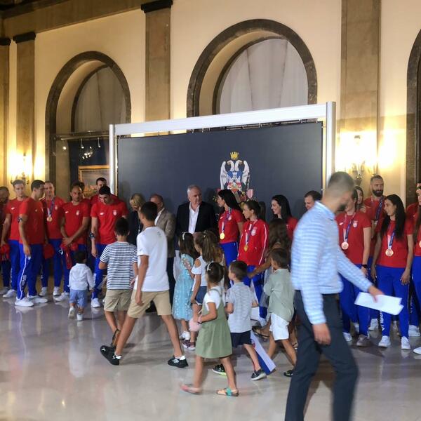 21:05 - Olimpijci sada prolaze kroz hol Skupštine Srbije i pozdravljaju se sa zamenikom gradonačelnika, Goranom Vesićem, kao i ministrom sporta i omladine, Vanjom Udovičićem.