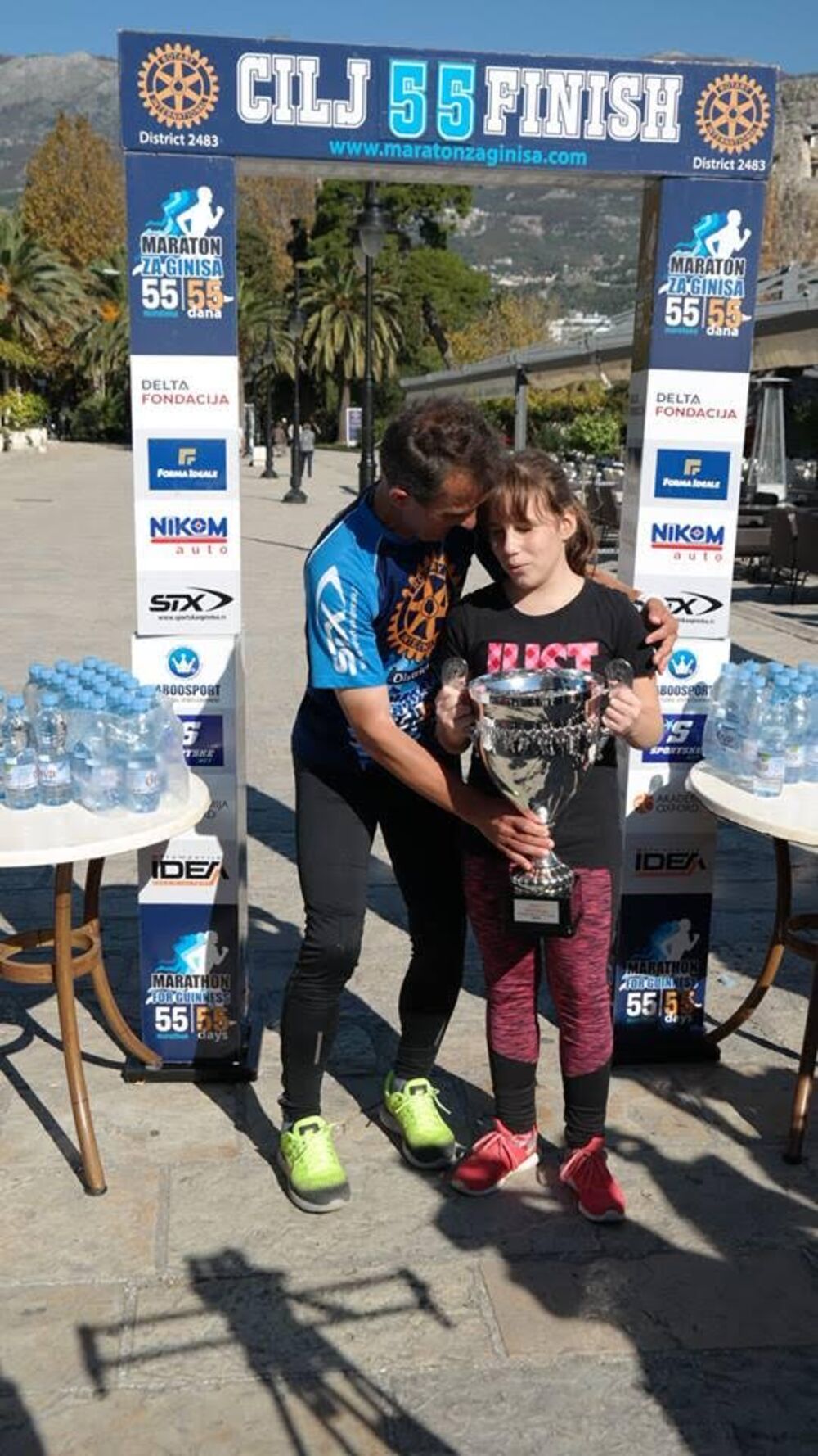 Zajedno sa njim je protrčala i devojčica Iskra koja je i počela sa njim maraton pre skoro dva meseca, a po prolasku kroz cilj dobio je i zasluženi pehar.