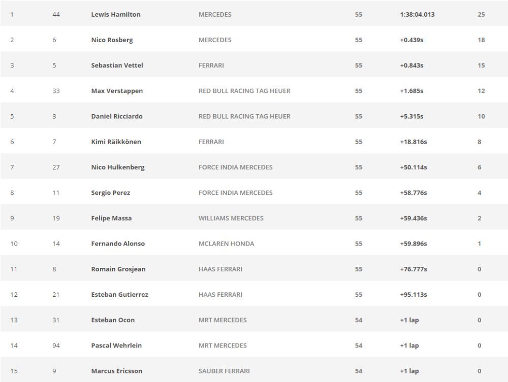 Pored odluke o svetskom šampionu, zanimljivosti su da je Felipe Masa u svojoj poslednjoj trci u karijeri osvojio bodove pošto je završio na 9. mestu, dok je bivši šampion Dženson Baton neslavno okončao svoju karijeru, odustajanjem.