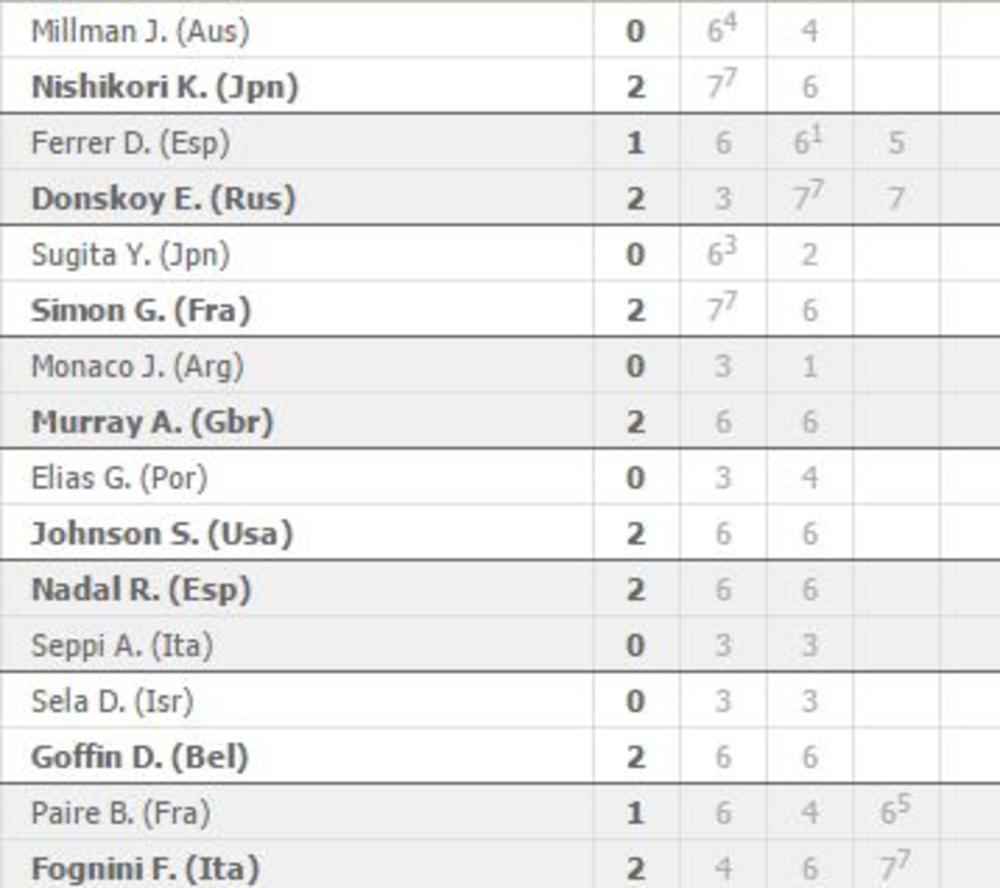 Del Potro (ARG) - Danijel Tor (JAP) Bautista-Agut (ESP) - Žil Miler (LUX) Nadal (ESP) - Simon (FRA) Kuevas (URU)/Beluči (ITA) - Gofan (BEL) Monfis (FRA) - Čilić (CRO) Martin (SLO) - Nišikori (JAP) Donskoj (RUS) - Džonson (USA) Fonjini (ITA) - Mari (GBR)