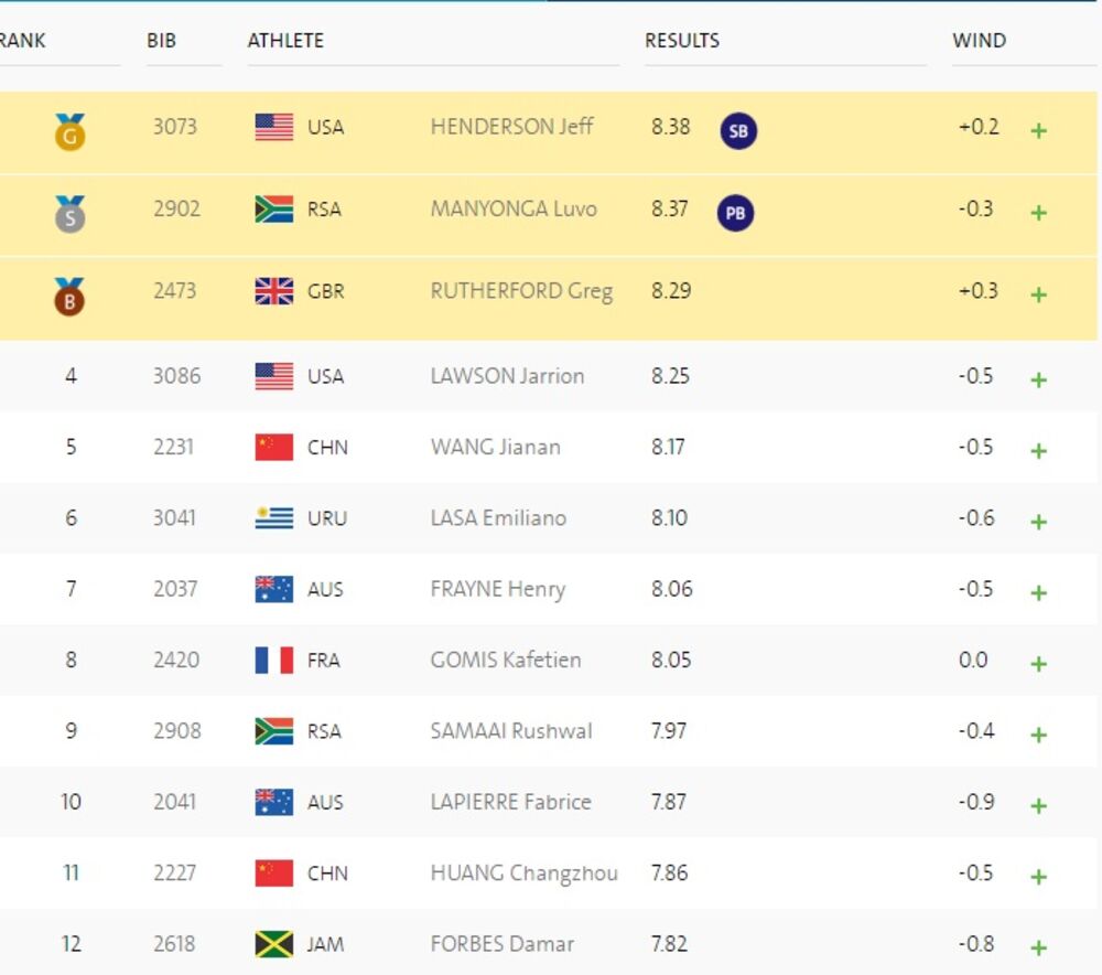 U skokovima, zlato je uzeo Amerikanac Džef Henderson, srebro je otišlo južnoafrikancu Luvo Manjongi, koji je ostvario lični rekord, a bronzanu medalju dobio je Greg Raterford iz Velike Britanije.