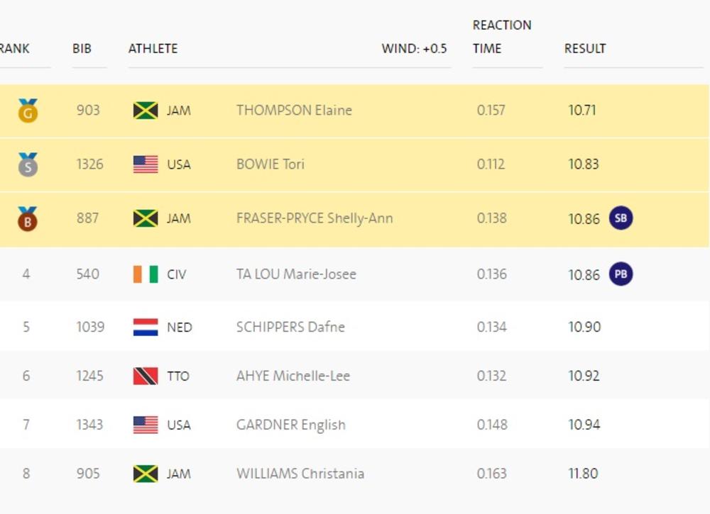 Kada su u pitanju dame na 100 metara, jedna od najzanimljivijih disciplina, zlato je uzela Elejn Tompson, srebrna je bila Tori Bouvi, dok je bronzu uzela Šeli En Frejzer Prajs.