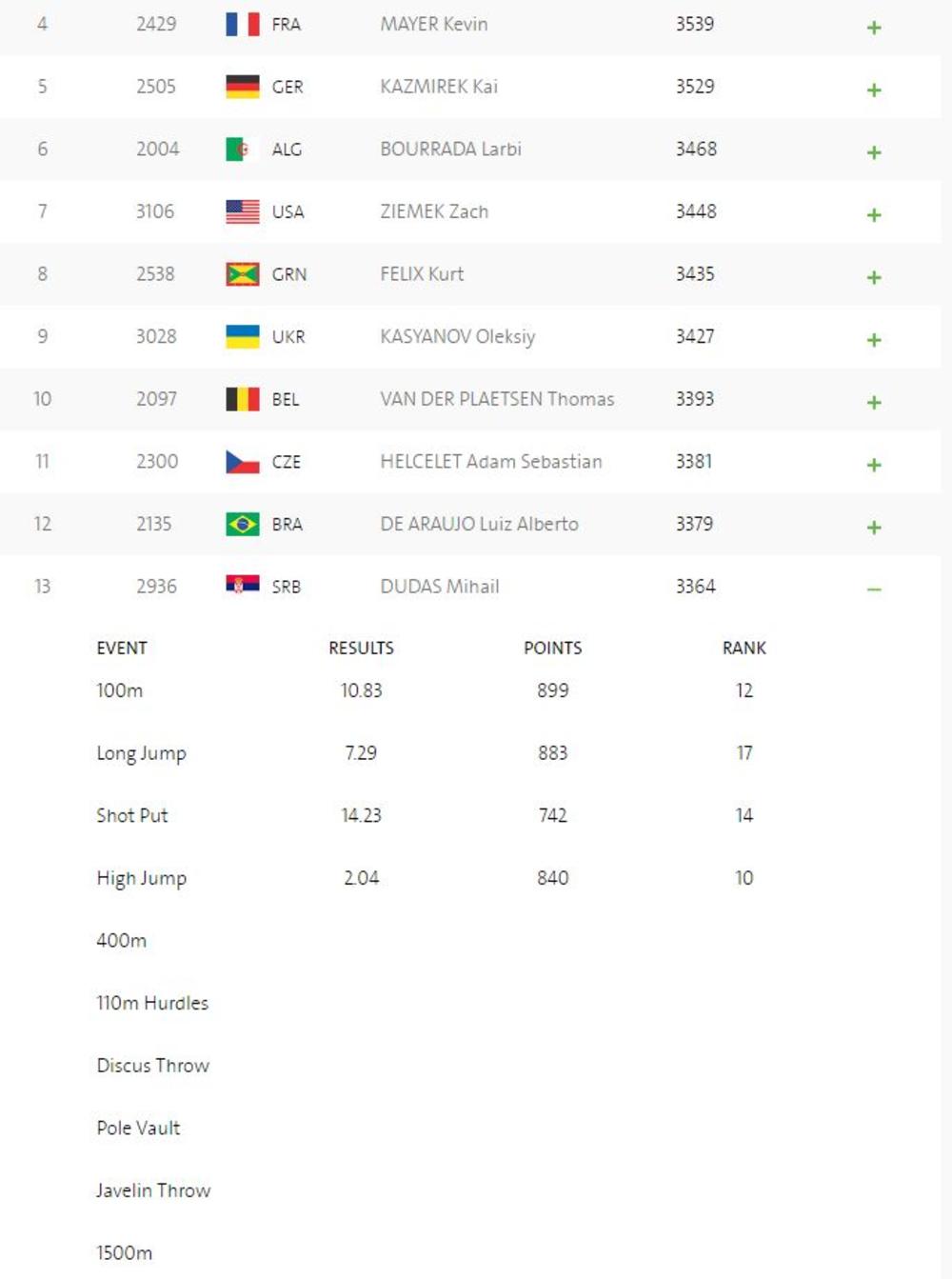 00:50 - Srpski desetobojac Mihail Dudaš trenutno je 13. u generalnom plasmanu. Sledi mu disciplina 400 metara, pa onda 110 sa preponama, disk, skok s motkom, bacanje koplja i na kraju trka na 1500 metara.