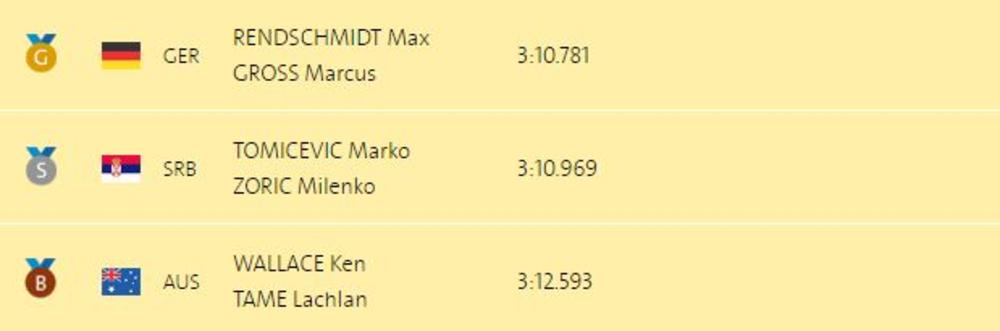 Zorić i Tomićević su trku završili vremenom 3.10.969 ispred Australijanaca. Prvo mesto osvojio je nemački par sa vremenom 3.10.781!
