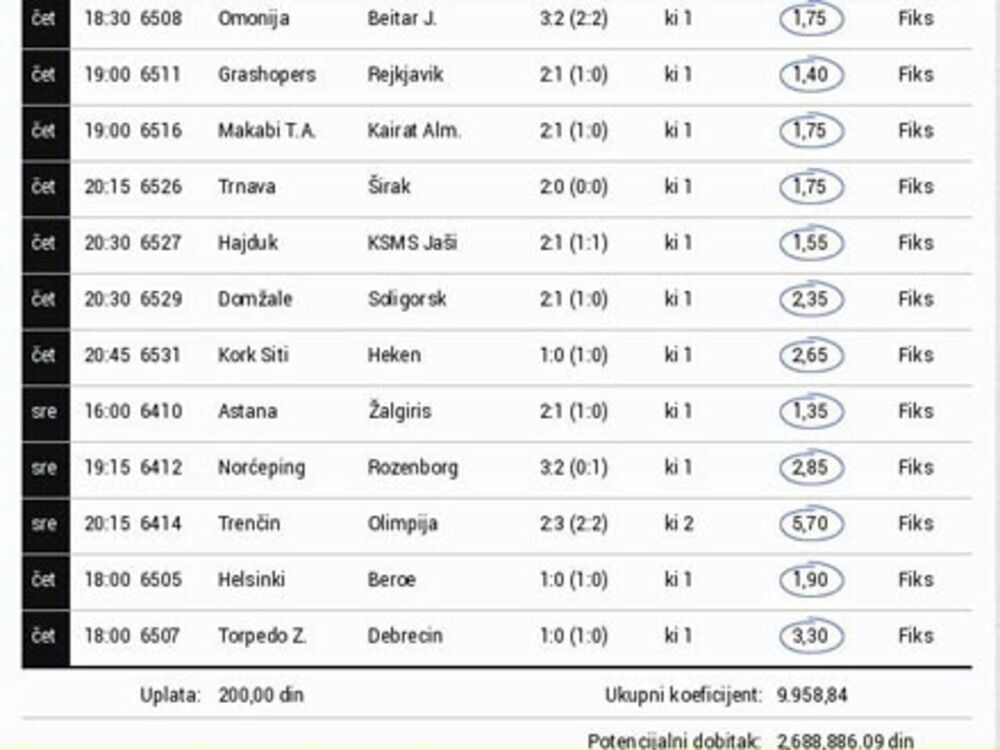 Makabi ga je obradovao u 86. minutu za 2:1 protiv Kairata.Hajduk je to učinio u 90, Astana u 92 minutu! - stoji na sajtu „Mocart sporta“. Na uplaćenih 200 dinara i ukupnim koeficijentom 9.958igrač iz Vranja zaradio je 2.688.886 dinara, a u ovu sumu uračunat je i bonus koji je na dvanaest odigranih parova povećao za 35 odsto, pošto je tiket odigran u toku akcije „Happy hour“.