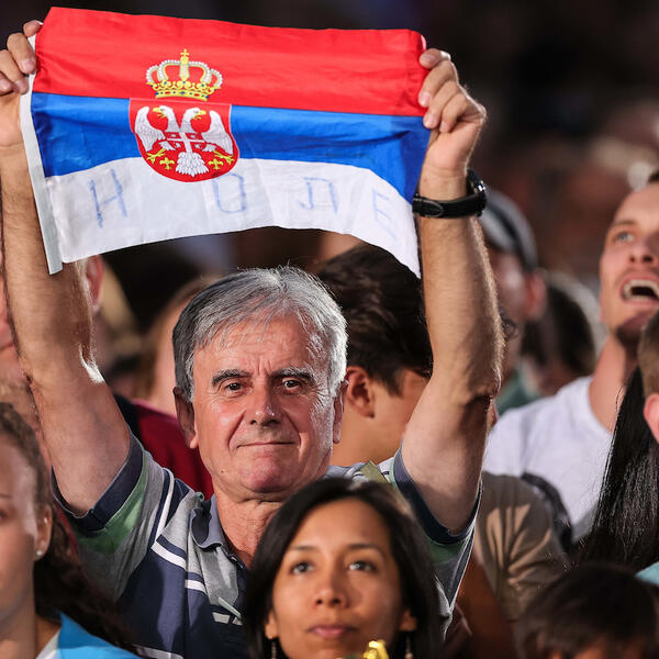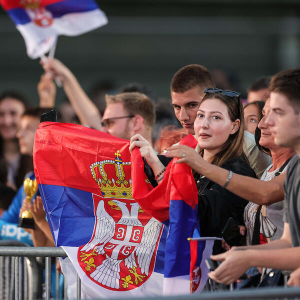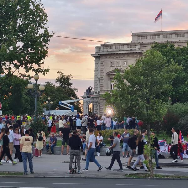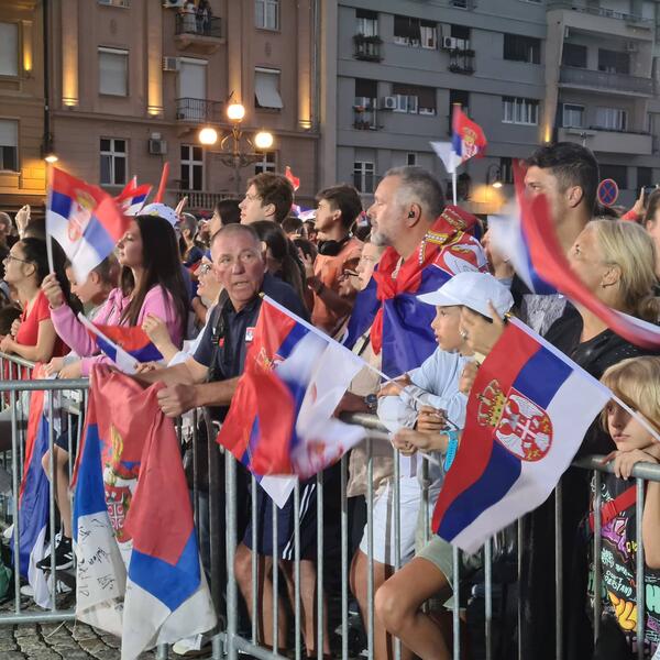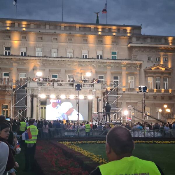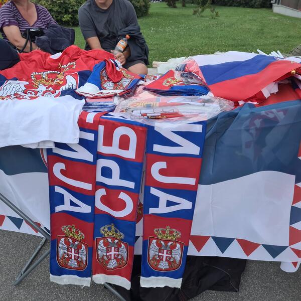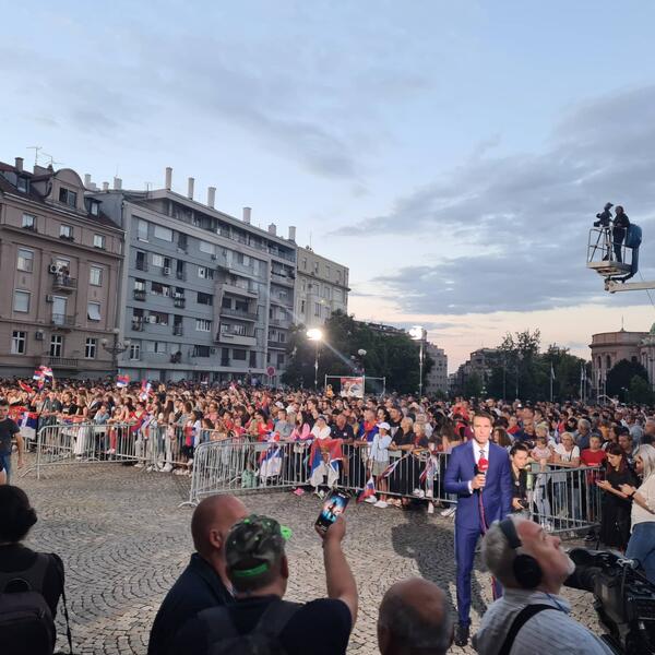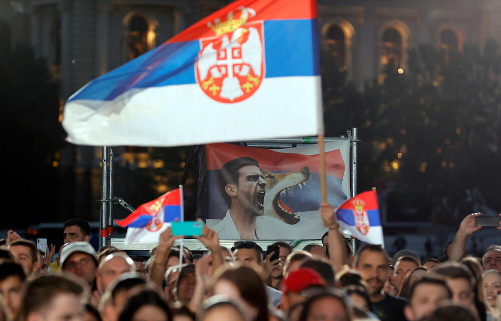 20.00 - narod polako ispunjava plato ispred Starog dvora. Prodaju se šalovi na kojima piše "Srbija", ali i "Novak" - za 100 dinara...