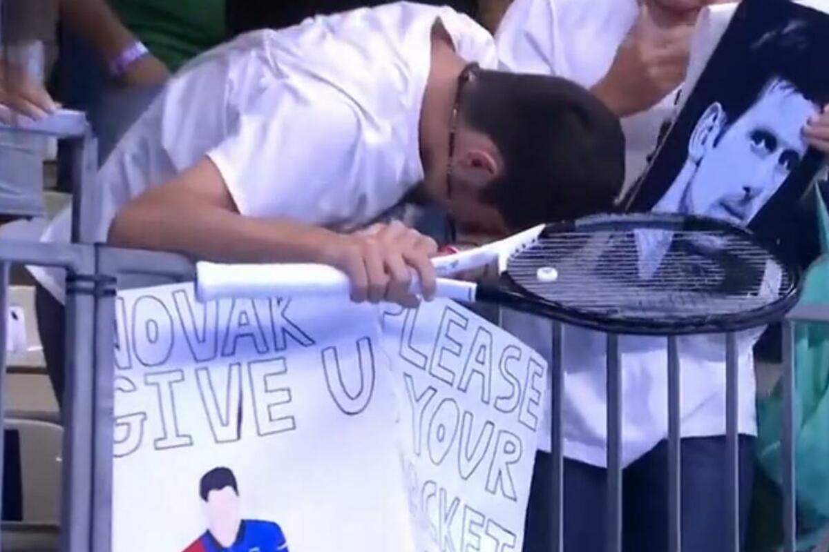 Nakon što je Đoković zaključio meč u dva seta protiv Vaseka Pospišila, pozdravio je publiku, a onda se uputio ka delu tribina iz asudije gde je jedan mladić držao baner "Novače, molim te mi pokloni reket".