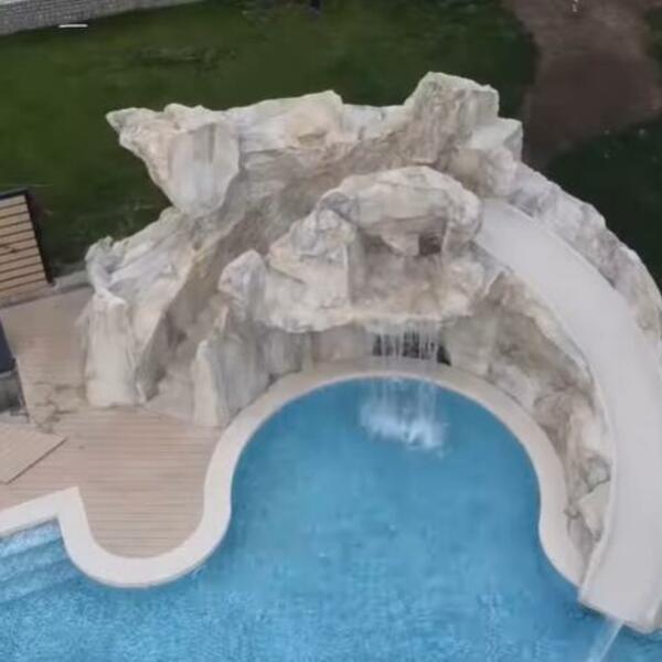 Na sredini je vodopad iz kojeg se voda sliva direktno u prostrani bazen. Ovo zdanje izgrađeno je na velikoj površni u gornjem delu dvorišta, odmah pored jezera, koje je u privatnom vlasništvu.