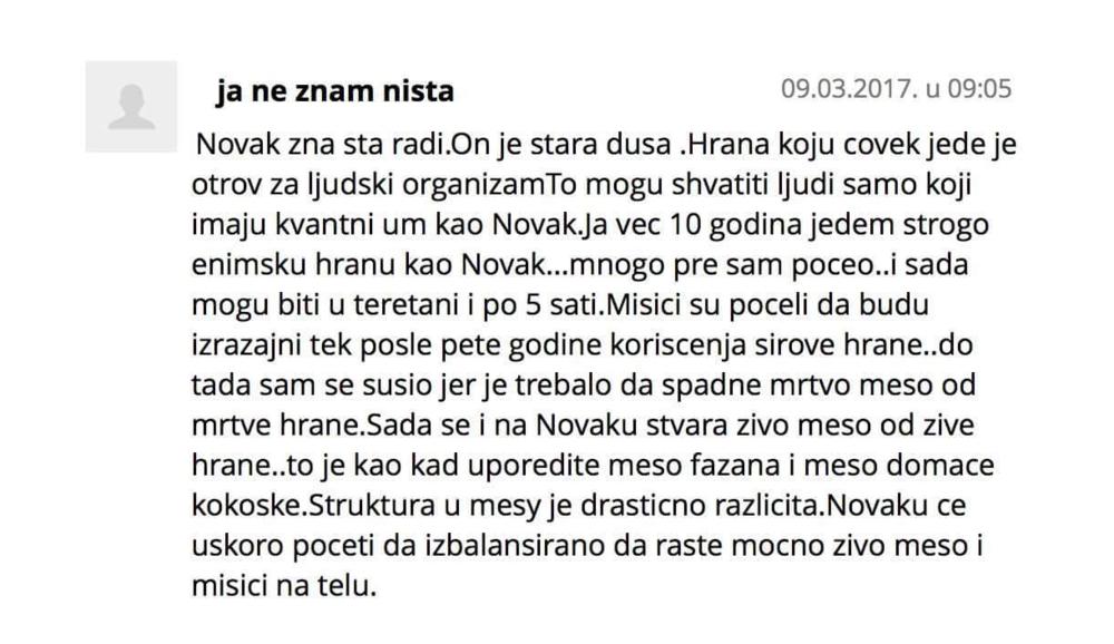 - Novak zna šta radi. On je stara duša. Hrana koju čovek jede je otrov za ljudski organizam. To mogu shvatiti samo ljudi koji imaju kvantni um kao Novak. Ja već 10 godina jedem strogo enimsku hranu kao Novak. Mnogo pre sam počeo i sada mogu biti u teretani i po pet sati. Mišići su počeli biti izražajni tek posle pete godine korišćenja sirove hrane. Do tada sam se sušio jer je trebalo prvo da spadne mrtvo mesto od mrtve hrane. Sada se i na Novaku stvara živo meso od žive hrane. To je kao kad uporedite meso fazana i meso domaće kokoške. Struktura u mesu je drastično različita. Novaku će uskoro početi da izbalansirano raste moćno živo meso i mišići na telu - piše u komentaru ovog čitaoca.