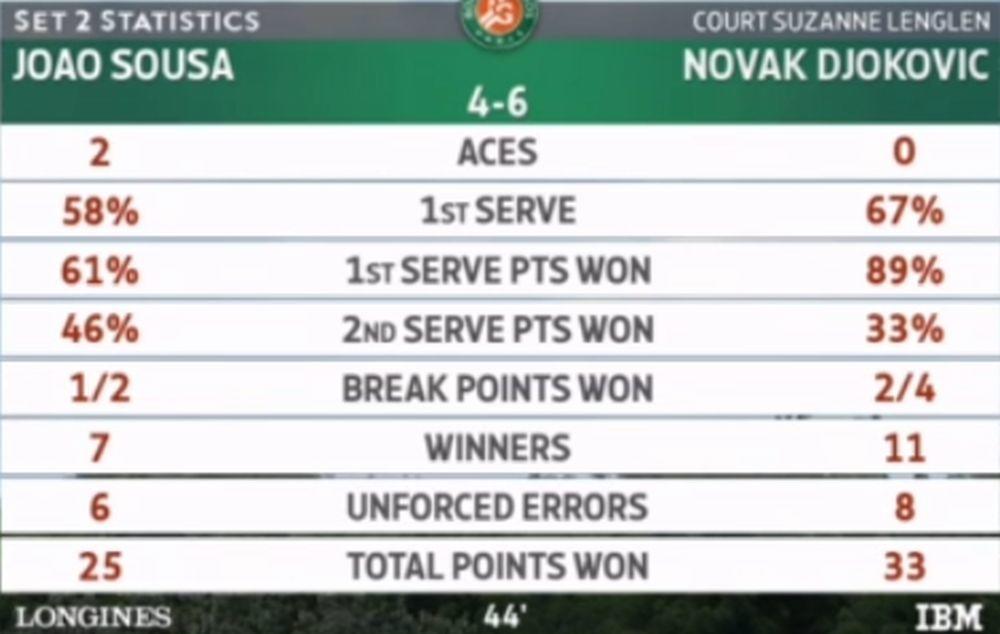2:2 - RIBREJK! Nismo se nadali da bi ovo moglo da se dogodi s obzirom na to kako se meč do sada razvijao, ali Portugalac je pogodio neko linija i sa par dobrih udaraca uz greške Novaka uspeva da povrati izgubljeni servis gem.