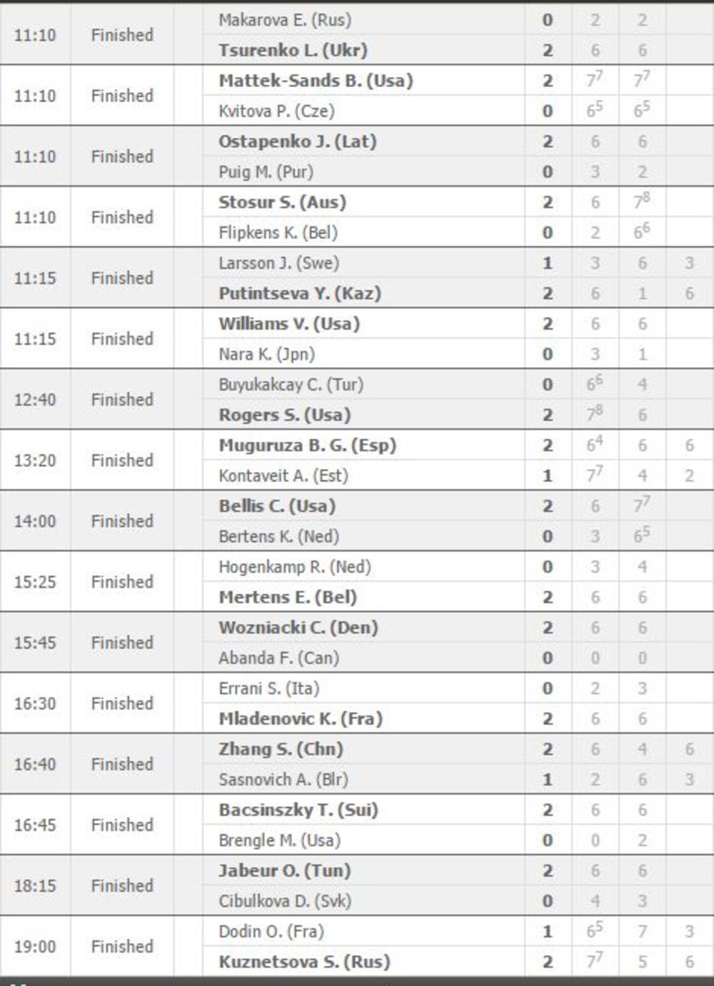 Razočarala je Petra Kvitova koja je poražena od Betani Matek Sands, kao i Dominika Cibulkova koja je eliminisana od Olge Džaber.
