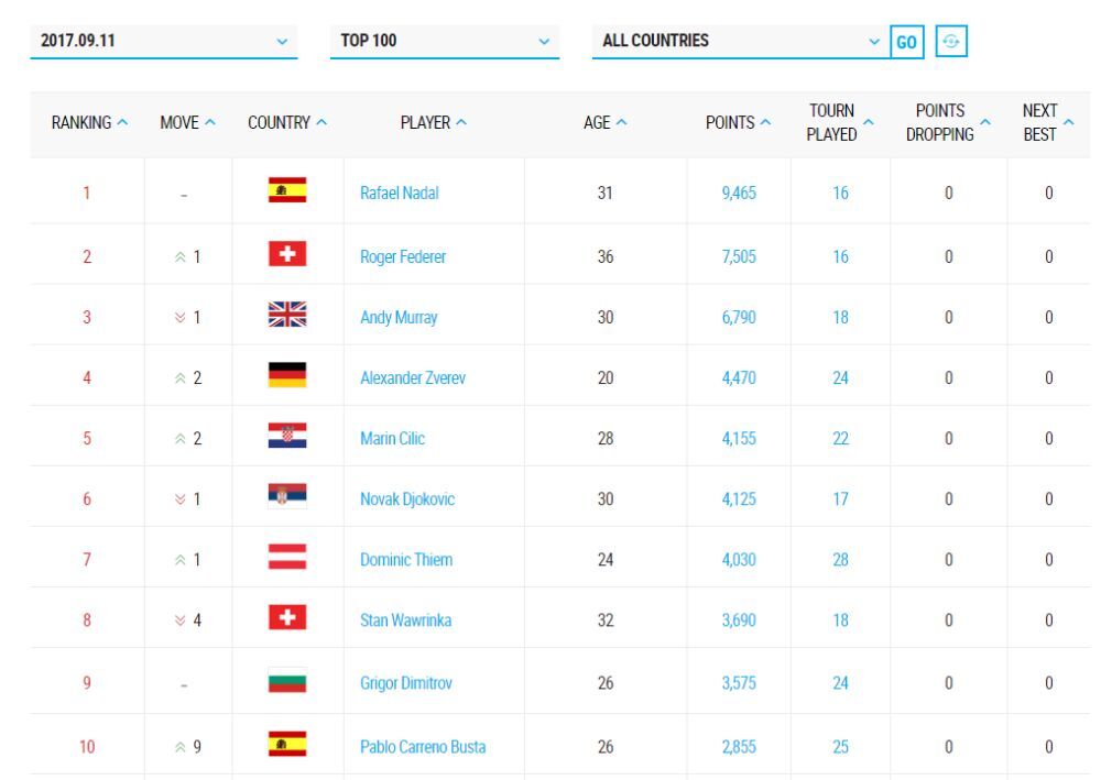 Švajcarac Sten Vavrinka nazadovao je čak četiri mesta do osme pozicije, a ispred njega je sada Dominik Tim, a iza Grigor Dimitrov.