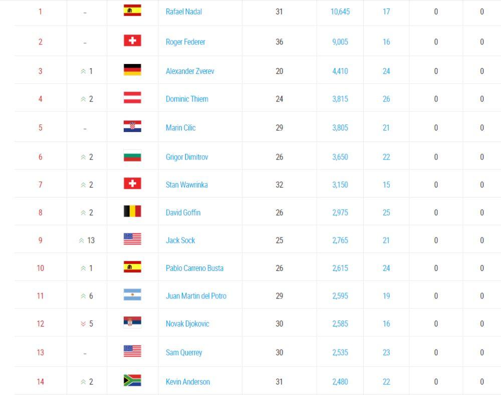 Što se tiče samog vrha, Nadal je i dalje prvi, a Federer drugi, dok je do najbolje pozicije u karijeri stigao Aleksandar Zverev koji je sada treći.