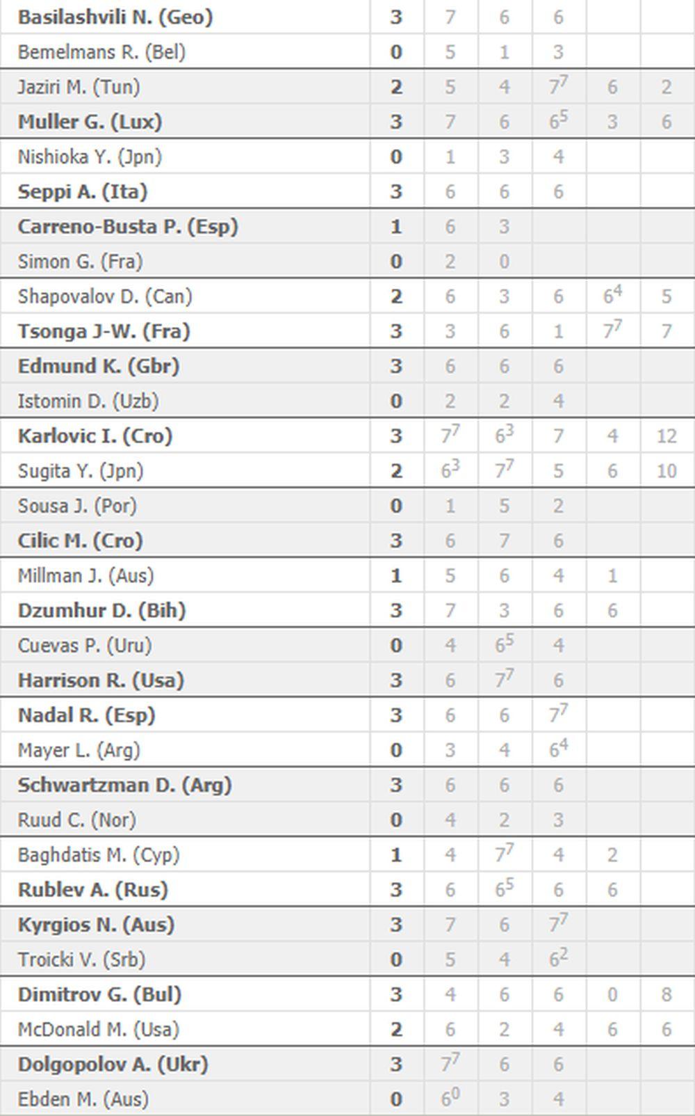 Uz španskog tenisera, trijumfe su ostvarili i Kirjos protiv našeg Troickog, Karlović, Džumhur, Conga posle velike borbe u pet setova, a istu golgotu je morao da prođe i Dimitrov protiv Mekdonalda.