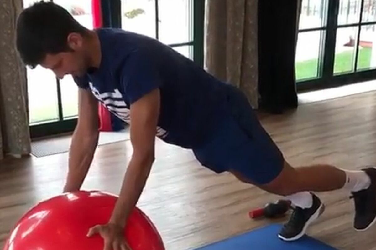 Sada je radio sa loptom za pilates i to vežbe koje služe baš za ojačavanje tog problematičnog lakta s kojim je imao mnogo, mnogo problema.