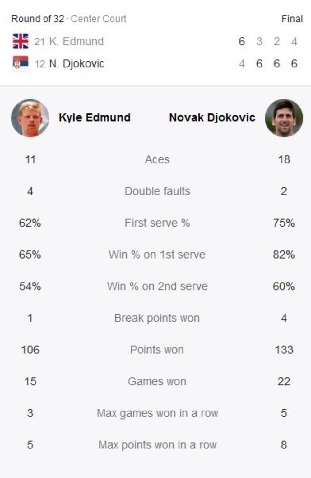 Nole je meč otvorio nedovoljno agresivno pa je nakon igre gem za gem, pri rezultatu 3:3 Edmund došao do prvog brejka na meču.