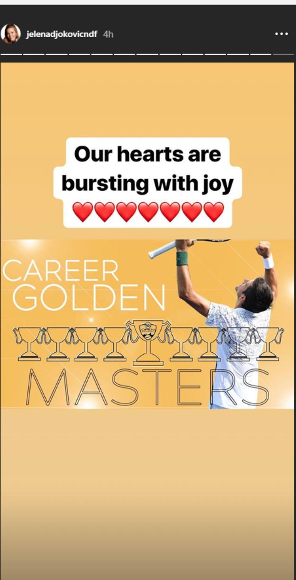 Supruga najboljeg srpskog tenisera Jelena Đoković ne krije sreću pošto je Nole u spektakularnom finalu Mastersa u Sinsinatiju konačno osvojio dugo čekani trofej kojim je upotpunio bogatu kolekciju.