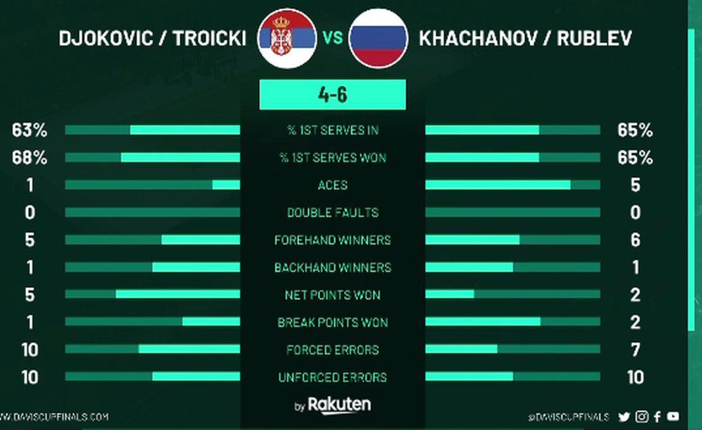 4:6 - Teniska reprezentacija Rusije osvaja prvi set. Rubljev je nastavio sa sjajnim servisom i tako je doneo veoma bitnu prednost Rusima. Veoma dobro igraju Kačanov i Rubljev.