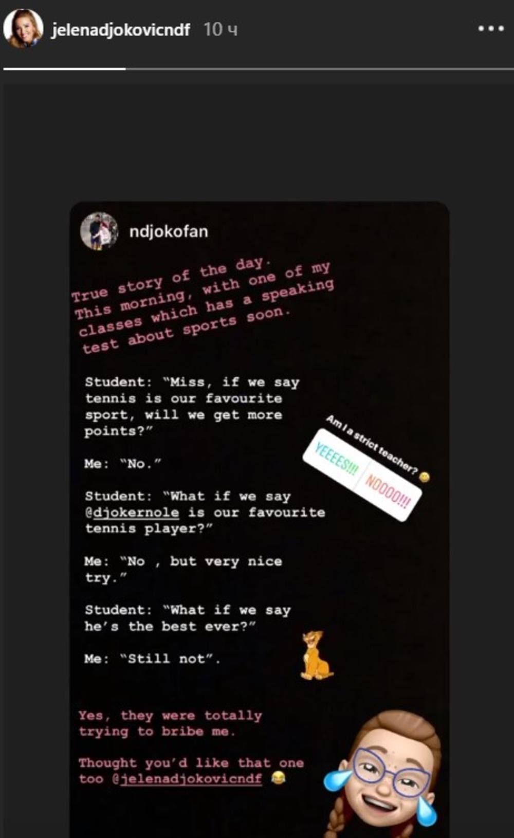 Naime, reč je o profesorki koja je veliki fan Novaka Đokovića, te su njeni učenici na taj način pokušali da dođu do boljih ocena.