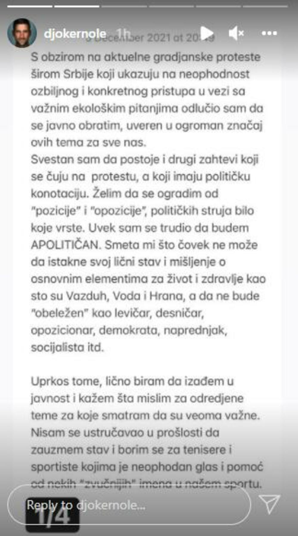 Najbolji teniser sveta Novak Đoković oglasio se nakon nedavnih protesta na ulicama Beograda i ostalih gradova Srbije i naveo da se trudi da bude apolitičan, ali da mu smeta što "čovek ne može da izrazi svoje mišljenje o osnovnim elementima za život i zdravlje".