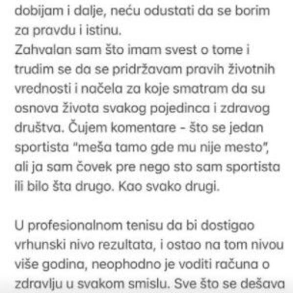 Zahvalan sam što imam svest o tome i trudim se da se pridržavam pravih životnih vrednosti i načela za koje smatram da su osnova života svakog pojedinca i zdravog društva. Čujem komentare - što se jedan sportista “meša tamo gde mu nije mesto”, ali ja sam čovek pre nego sto sam sportista ili bilo šta drugo. Kao svako drugi.