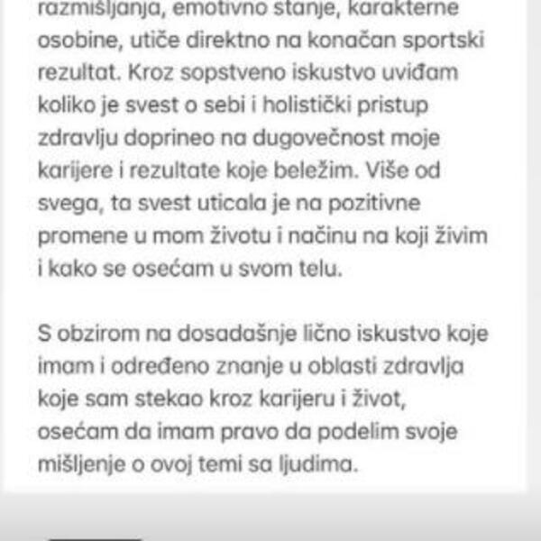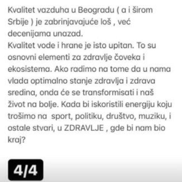 Kvalitet vode i hrane je isto upitan. To su osnovni elementi za zdravlje čoveka i ekosistema. Ako radimo na tome da u nama vlada optimalno stanje zdravlja i zdrava sredina, onda će se transformisati i naš život na bolje. Kada bi iskoristili energiju koju trošimo na sport, politiku, društvo, muziku, i ostale stvari, u ZDRAVLJE , gde bi nam bio kraj? - piše u Novakovom saopštenju.