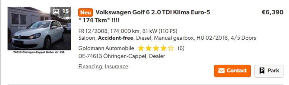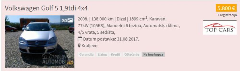 Golfa 5 u Nemačkoj ne možete ni da nađete na oglasima, kod nas je cena sa navodnih 138.000km pređenih oko 5.800e, dok kod njih možete samo da nađete šesticu i to teško sa kilometražom ispod 200.000, ali nema cene ispod 6.300evra.