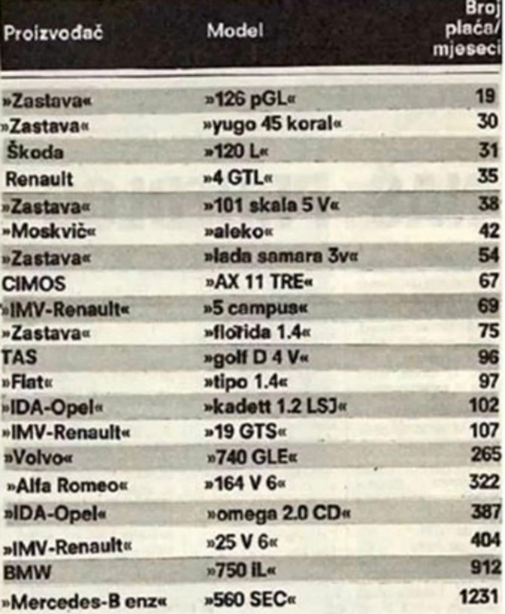 Najdostupniji kompaktni porodični automobil je bila Zastava 101 za 38 plata, a zatim su sledili ruski ponosi, Aleko za 42 i Lada Samara za 54 plate.