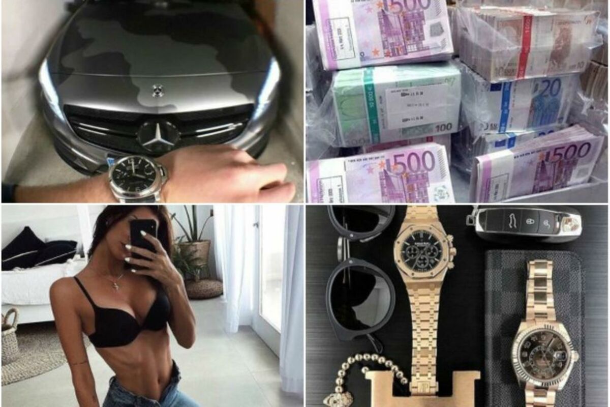 Tu su skupocena kola, razmetanje novcem, satovima i telefonima, kao i pregršt fotografija devojaka u izazovnim pozama.