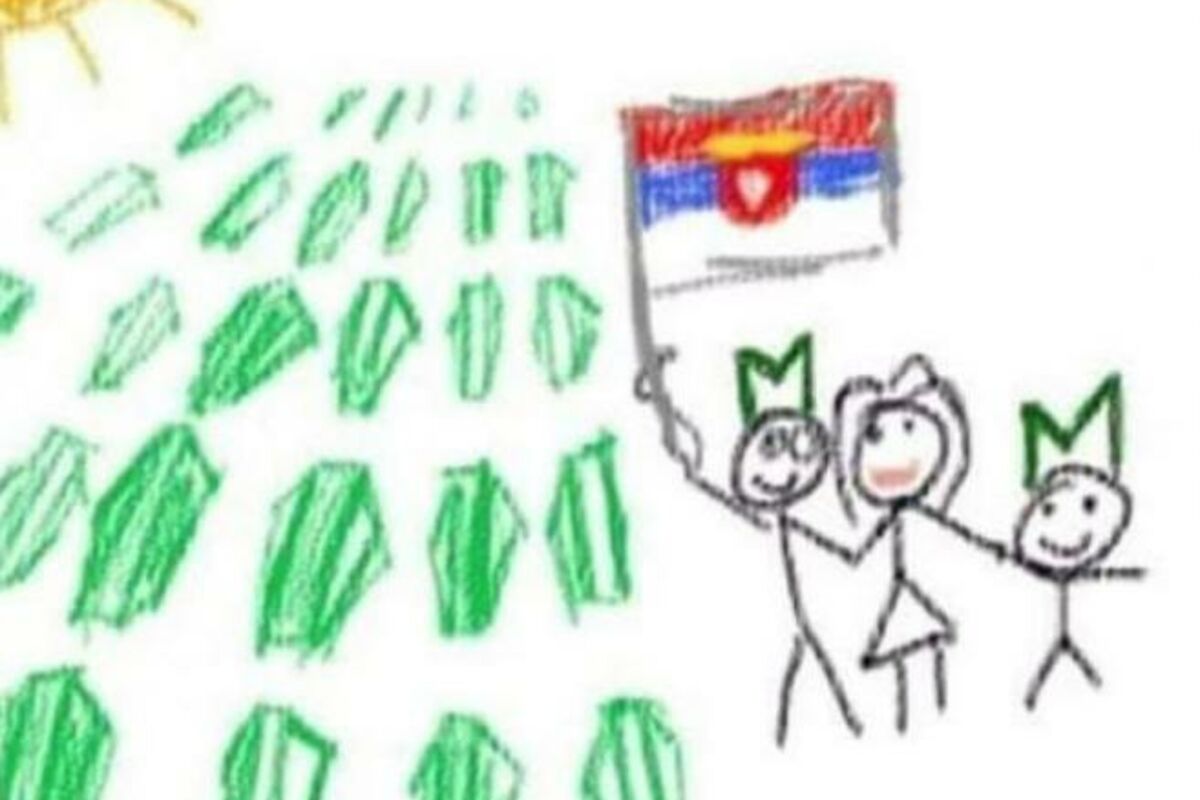 Naime, objavljen je crtež dečaka predškolskog uzrasta. Dečak je nacrtao sebe i svog prijatelja sa šajkačama na glavama, zagrljene s prijateljicom. U ruci drži zastavu Republike Srpske. Njih troje, što ilustrira i crtež, nasmejani stoje pored brojnih tabuta.