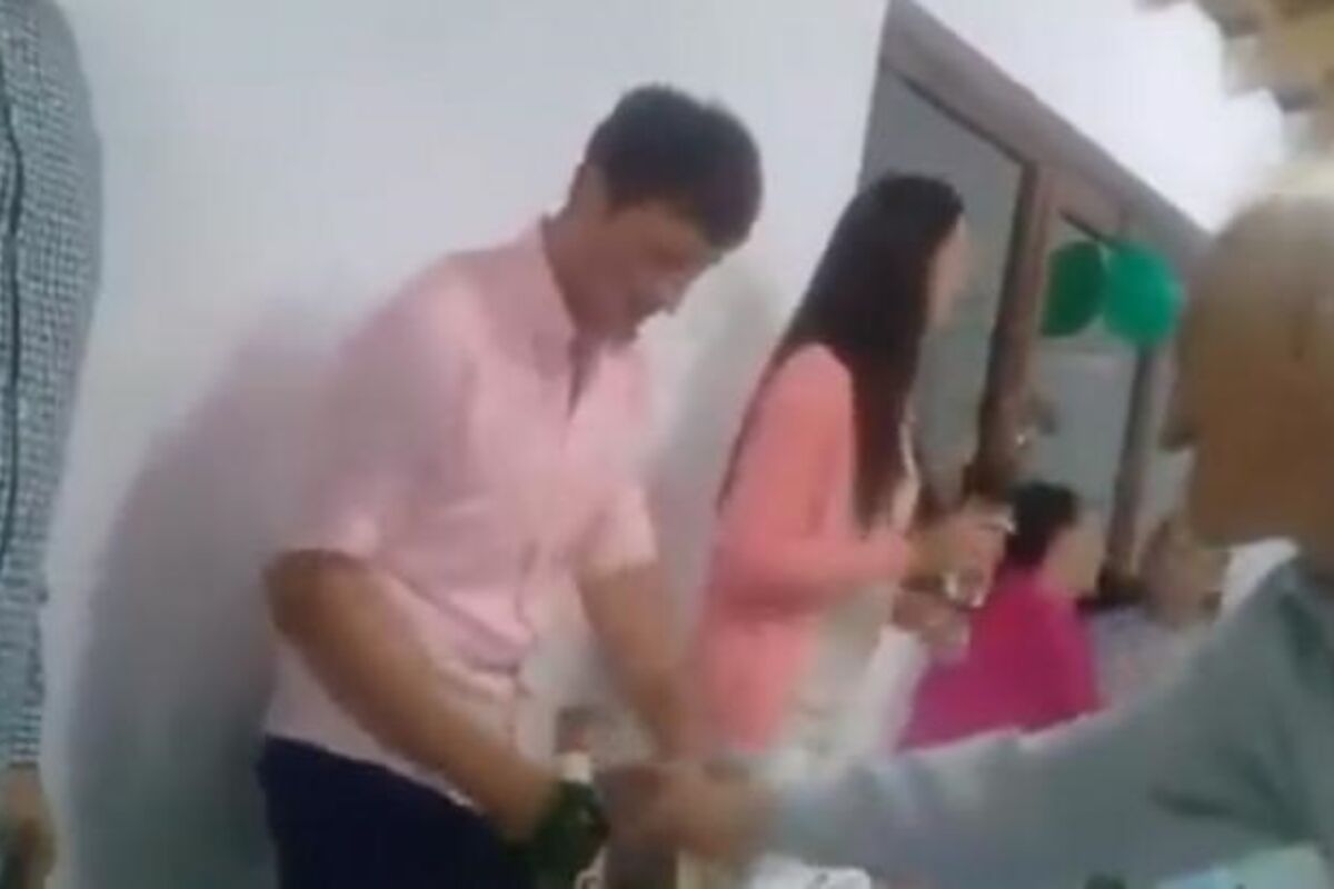 Na snimku koji traje nešto duže od pola minuta vidi se kako svi radosno igraju i piju sem jednog muškarca pored kojeg pleše žena, za koju se pretpostavlja da je njegova supruga.