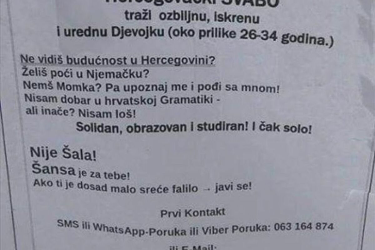 HERCEGOVAČKI ŠVABO, OBRAZOVAN I STUDIRAN, TRAŽI DEVOJKU: Ovaj ljubavni oglas je nasmejao Balkan