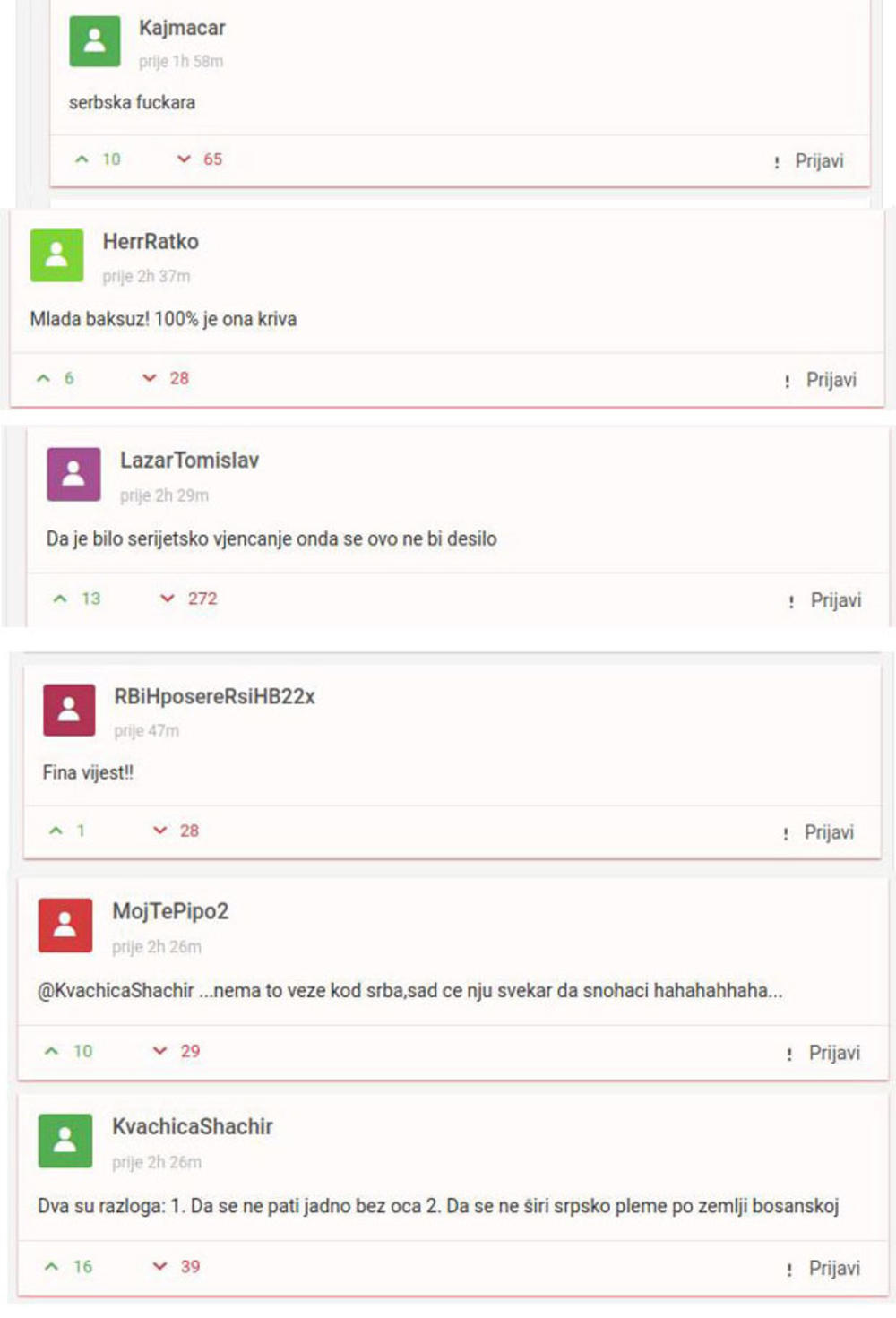 Tako su ovaj tekst ubrzo preplavili komentari tipa "neko mora da ispašta zbog genocida", da se nesreća ne bi dogodila da je bilo "šerijatsko venčanje", da je tragično nastradali mladić "srpska fukara", ali i oni najodvratniji u kojima se bolesni čitaoci naslađuju zbog pogibije mladića, jer se "srpsko seme neće širiti po bosanskoj zemlji". Kao da lavina užasnih komentara inspirisanih mržnjom prema srpskom narodu ispod teksta na portalu nije bila dovoljna, naslađivanje ovom nesrećom nastavilo se i na Facebook stranici ovog portala, na kojoj je šerovana vest.