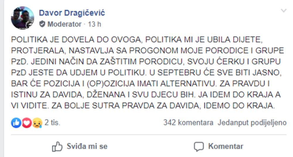 - Politika je dovela do ovoga, politika mi je ubila dijete, protjerala, nastavlja s progonom moje porodice i grupe ''Pravda za Davida''. Jedini način da zaštitim porodicu, svoju kćerku i grupu PzD jeste da uđem u politiku, u septembru će sve biti jasno, barem će pozicija i (op)pozicija imati alternativu - napisao je Davor Dragičević.