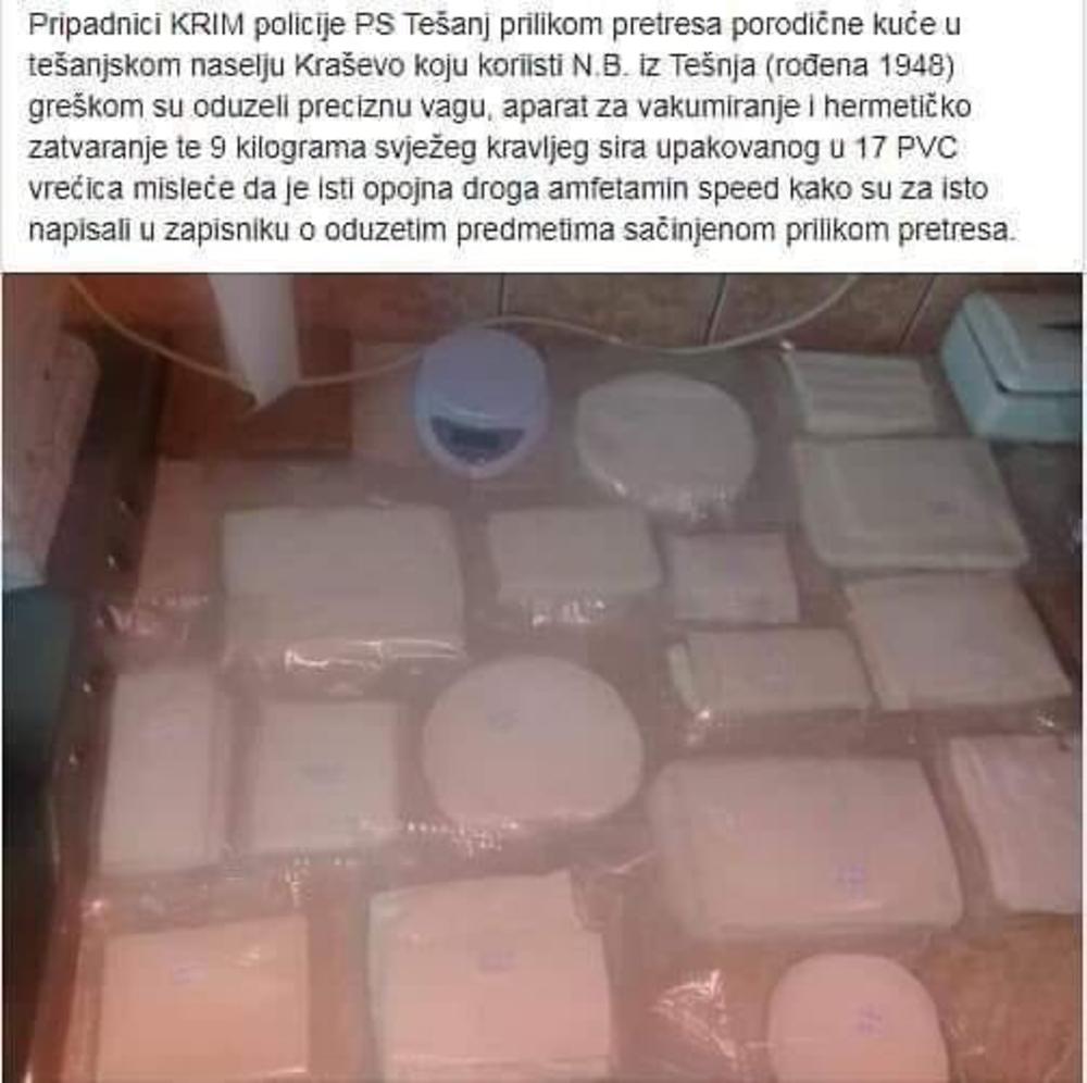 Početkom septembra 2019. na društvenim mrežama je deljena viralna fotografija na kojoj je prikazan deo Facebook objave, bez informacije na kojem profilu je objavljena. Objava sadrži “informaciju” o akciji tešanjske policije u kojoj su policajci zaplenili sir misleći da je reč o drogi “spid”.