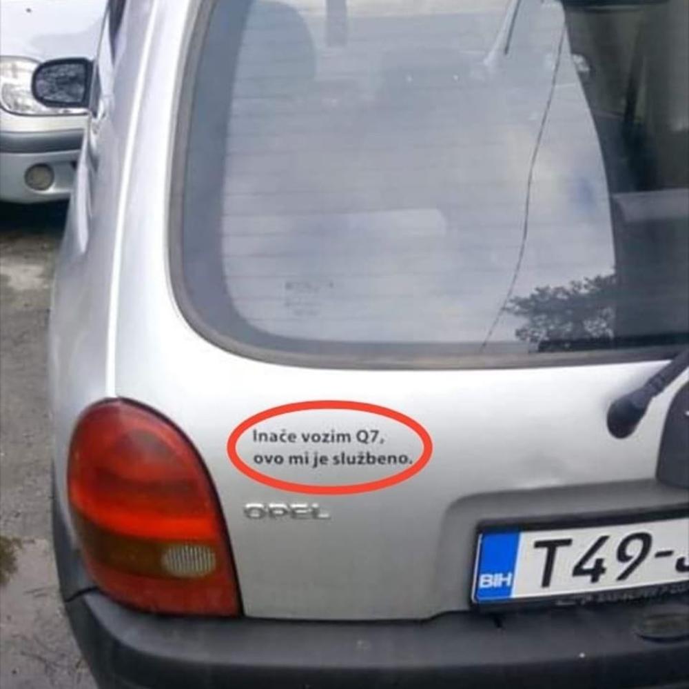 Na Facebooku je osvanula slika automobila marke Opel koji na svom gepeku ima natpis ,, Inače vozim Q7, ovo mi je službeno " , koja je pokrenula lavinu komentara i smeha.