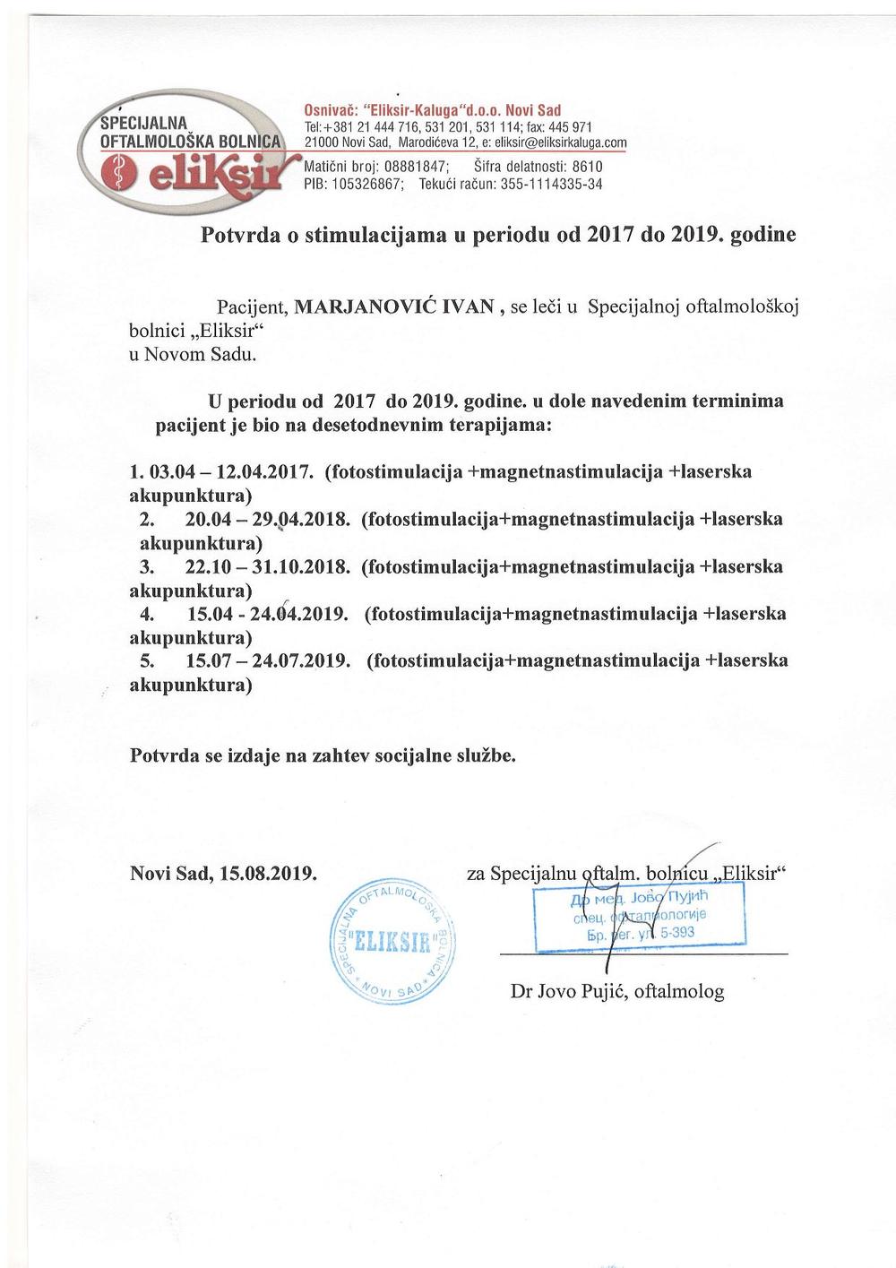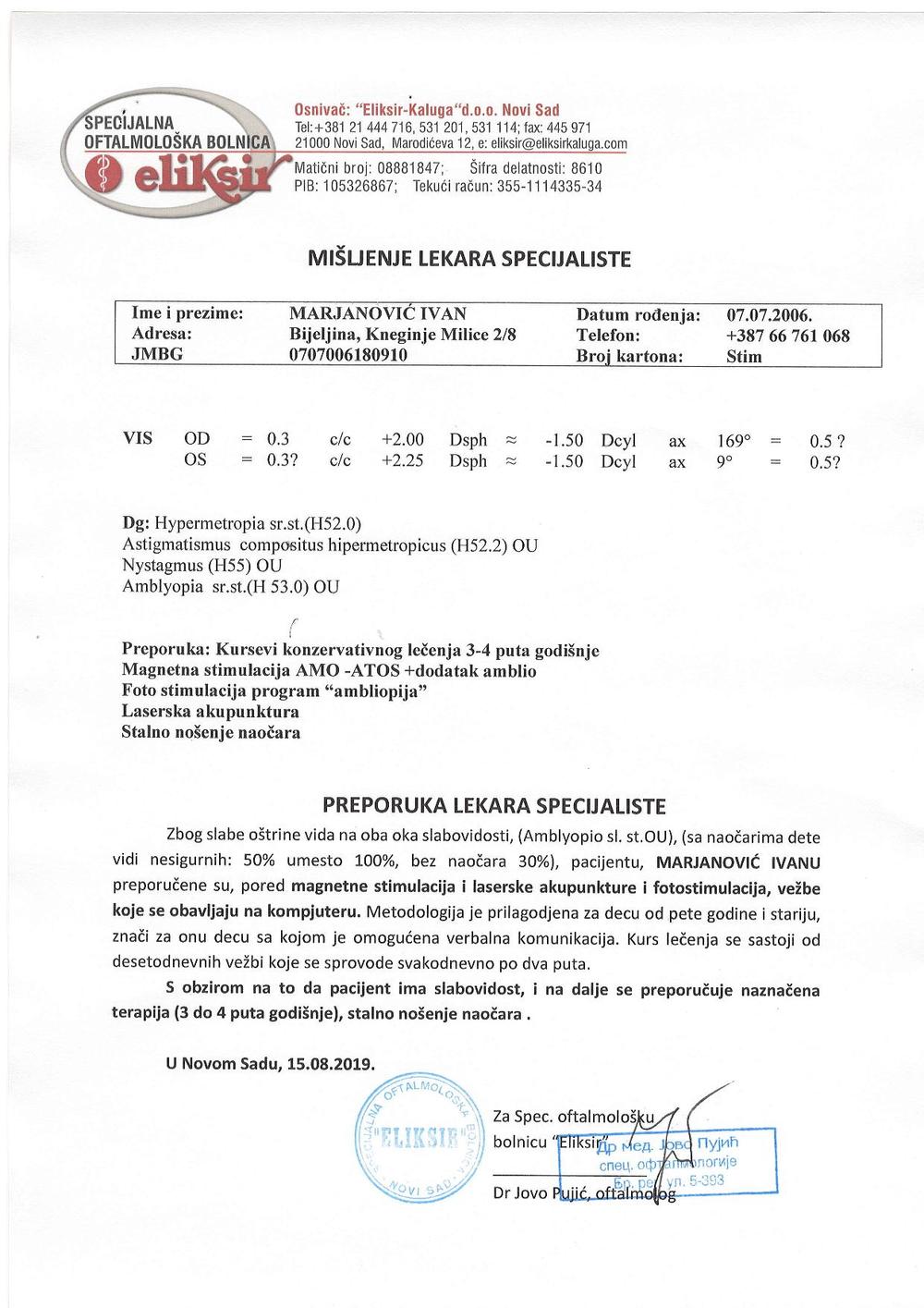 Ivan Marjanović (14) od rođenja ima ozbiljan problem sa vidom zbog čega na svaka tri, četiri meseca u kliniku 'Eliksir' u Novom Sadu na lečenje gde je boravio četiri puta do sada i stanje mu se poboljšalo.
