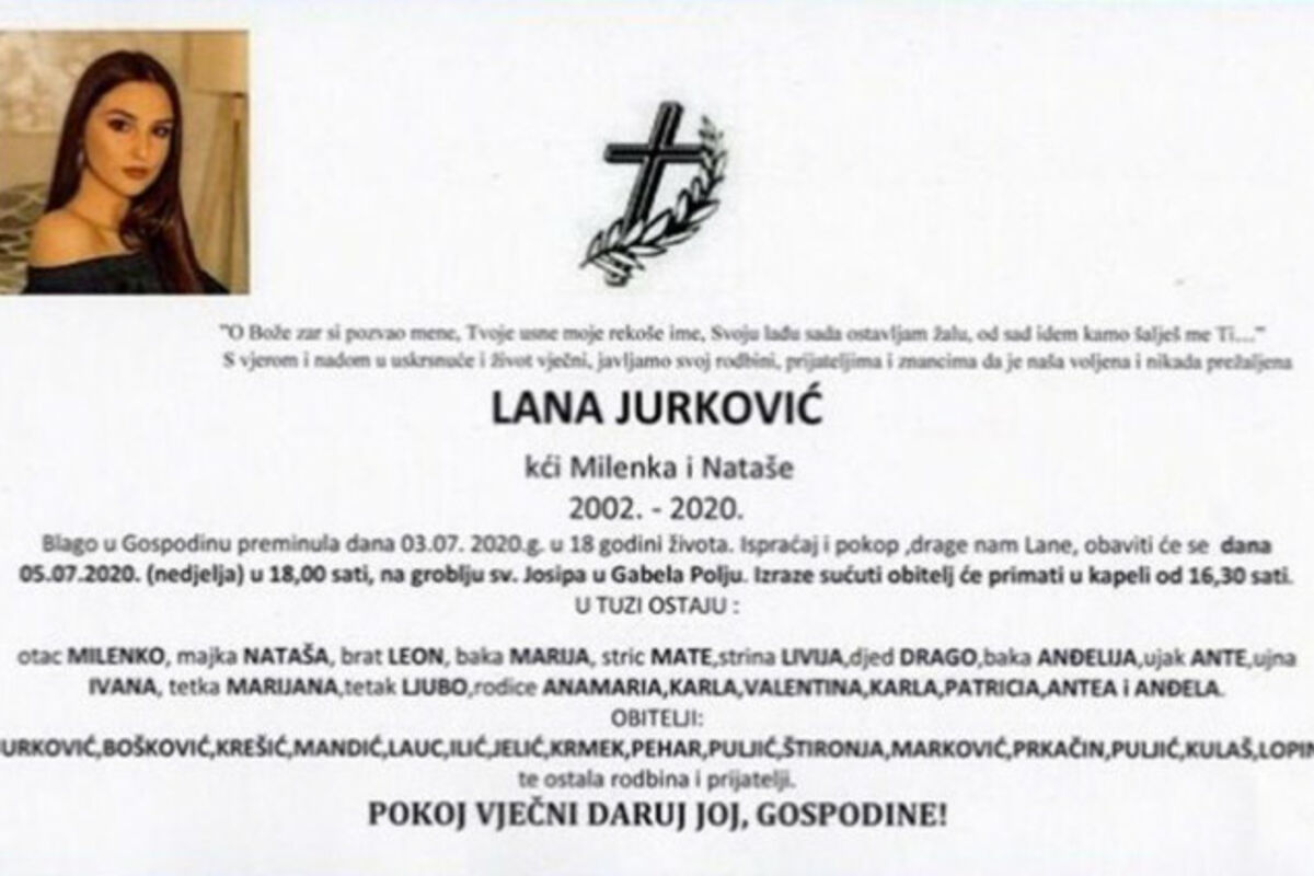 Ispraćaj i sahrana Lane Jurković biće obavljen sutra s početkom u 18 sati na groblju sv. Josipa u Gabela Polju.