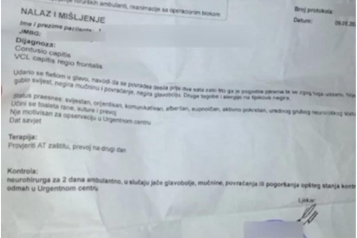 - Udario se flašom u glavu, navodi da se povreda desila pre dva sata zato što ga je pogodila pesma, pa se zbog toga udario - stoji između ostalog u nalazu.