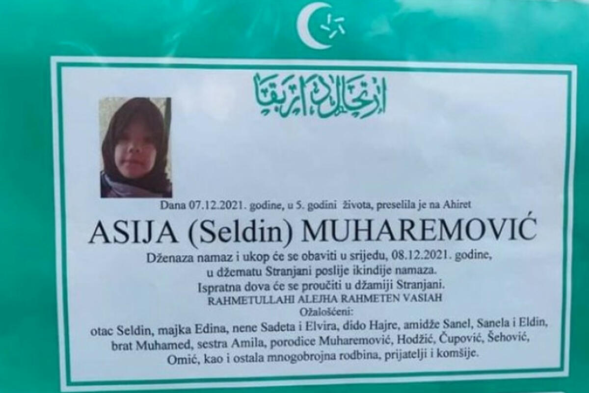 U Zenici je juče preminula petogodišnja devojčica Asija Muharemović iz mesta Stranjani.