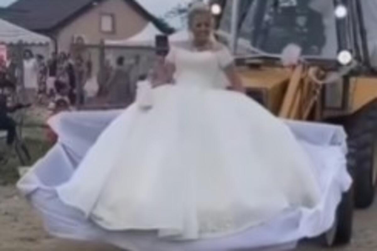 Naime, da se slučajno pažnja ne bi skrenula sa mlade, žena u belom odlučila je da sedne, ni manje ni više, nego na bager koji će da je provoza kako bi je svi gosti dobro osmotrili.