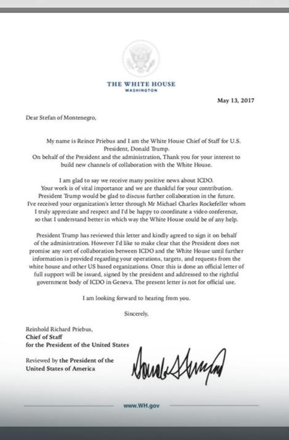 - Ipak, voleo bih da naglasim da predsednik ne obećava bilo kakvu saradnju između ICDO i Bele kuće dok ne bude imao više informacija o vašim operacijama, metama, i zahtevima od Bele kuće i američkih organizacija. Kada se to ispuni, biće poslato zvanično pismo sa punom podrškom, potpisano od strane predsednika i uručeno odgovarajućem telu ICDO organizacije u Ženevi. Ovo pismo nije za zvaničnu upotrebu - završava navodno pismo Priebus.