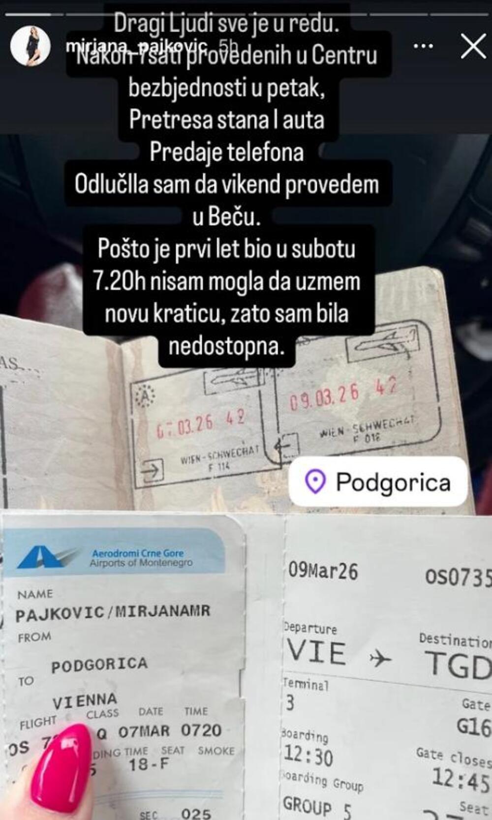 “Dragi ljudi, sve je u redu. Nakon sedam sati provedenih u Centru bezbjednosti u petak, pretresa stana i auta, te predaje telefona, odlučila sam da vikend provedem u Beču. Pošto je prvi let bio u subotu u 7:20, nisam mogla da uzmem karticu i bila sam nedostupna”, poručila je Pajković..
