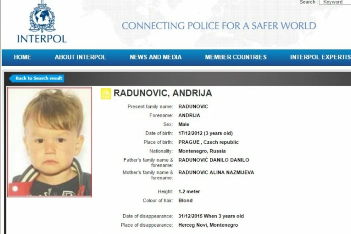 Slika trogodišnjeg dečaka Andrije Radunovića objavljena je na sajtu Interpola uz objašnjenje da je poslednji put viđen u Crnoj Gori.