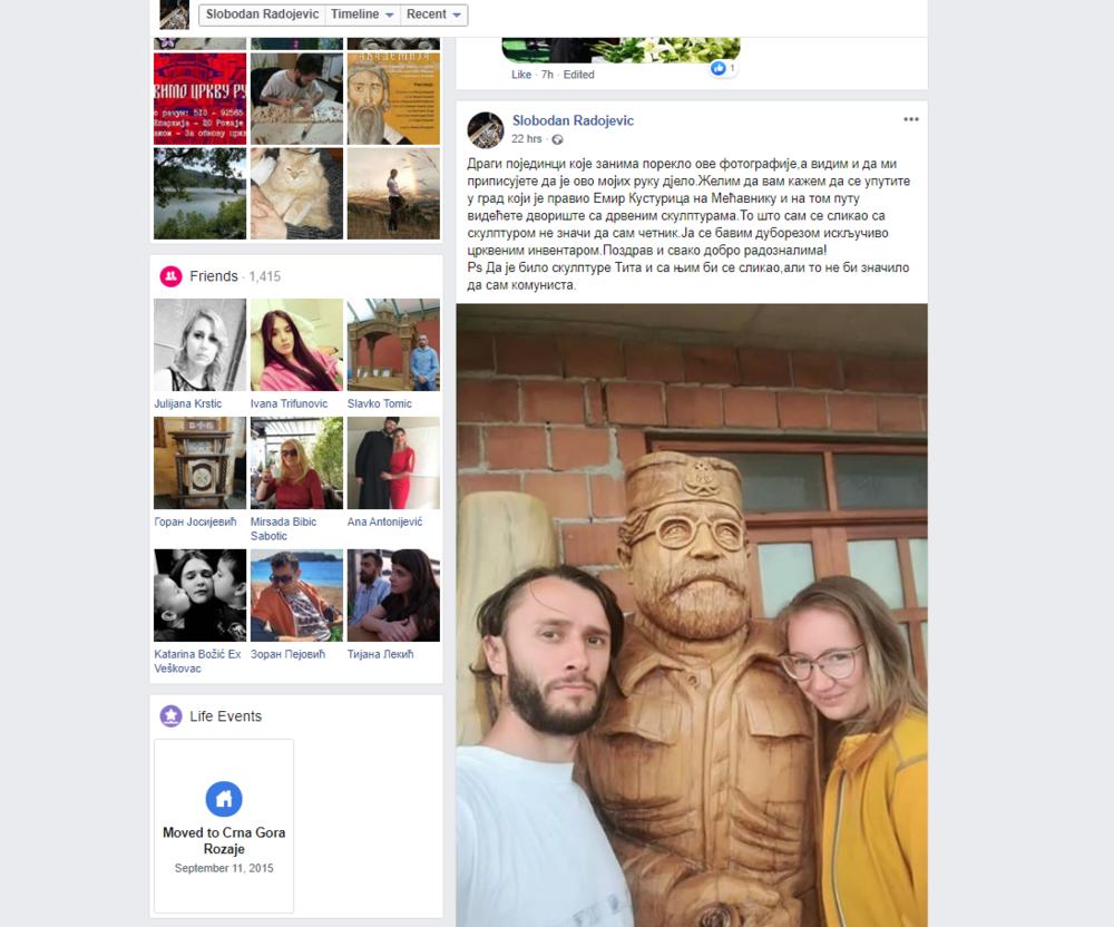 Na Fejsbuk stranici Rožaje, na kojoj je sporna fotografija objavljena, tvrdi se da je drvenu skulpturu četničkog komandanta isklesao sam Radojević.