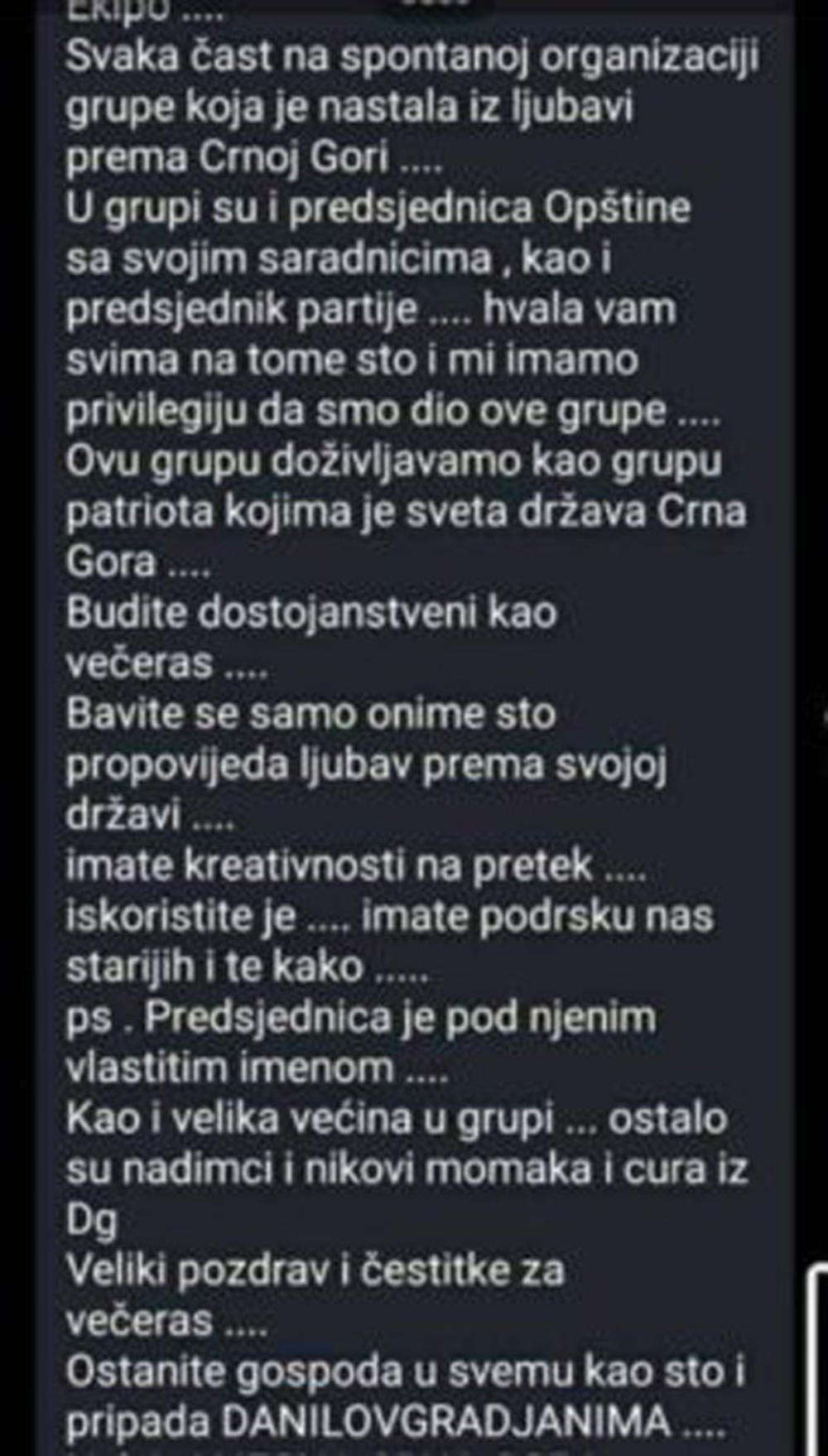 - Ekipo, svaka čast na spontanoj organizaciji grupe koja je nastala iz ljubavi prema Crnoj Gori. U Grupi su predsednica Opštine sa svojim saradnicima kao i predsednik partije. Ovu grupu doživljavamo kao grupu patriota kojima je sveta država Crna Gora. P.S. Predsednica je pod njenim vlastitim imenom, kao i velika većina u grupi ostalo su nadimci i nikovi momaka i cura iz DG - navodi se u grupi.
