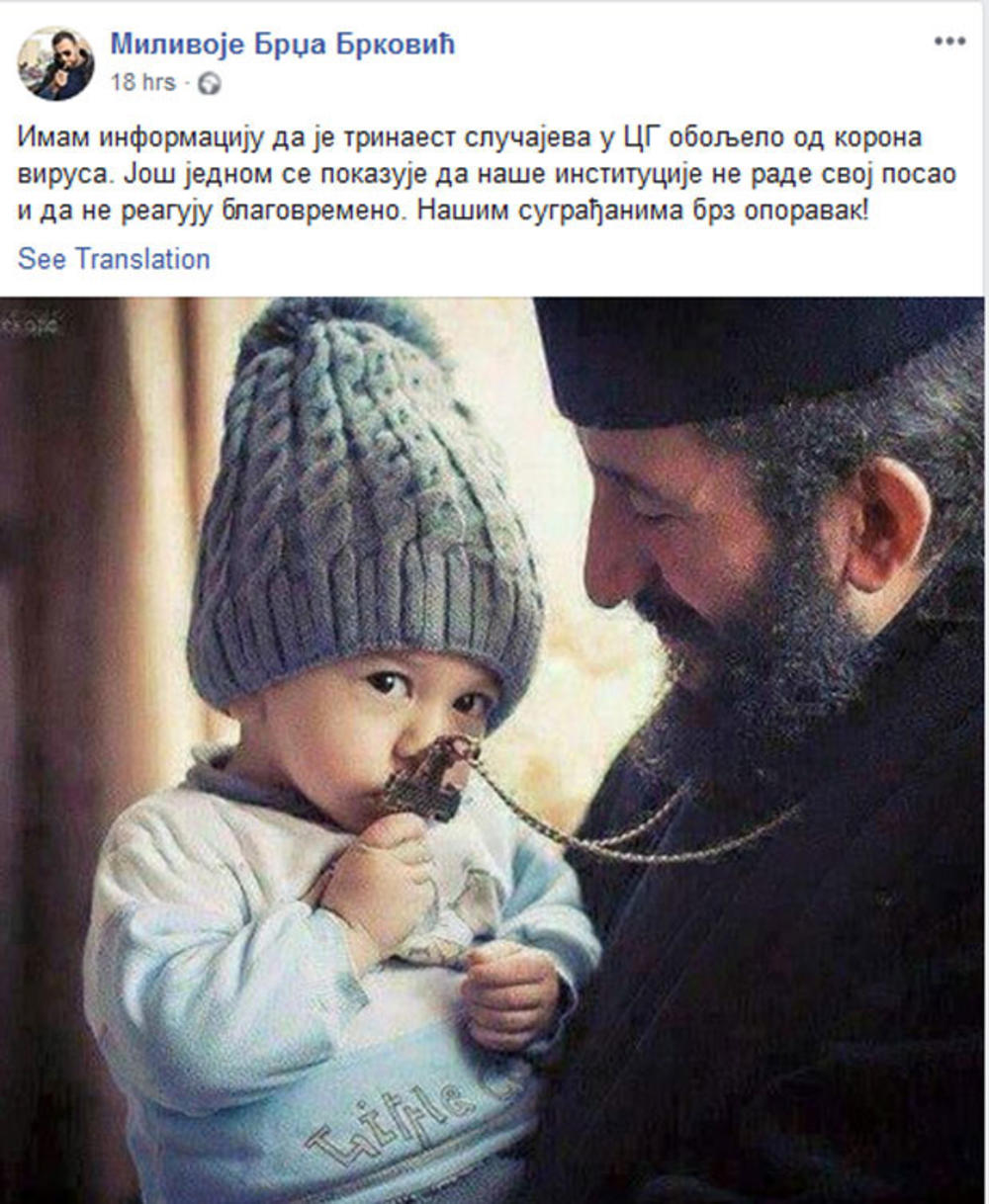-Imam informaciju da je trinaest slučajeva u Crnoj Gori obolelo od virusa korona. Još jednom se pokazuje da naše institucije ne rade svoj posao i da ne reaguju blagovremeno. Našim sugrađanima brz oporavak!-napisao je Brdža zbog čega je uhapšen.