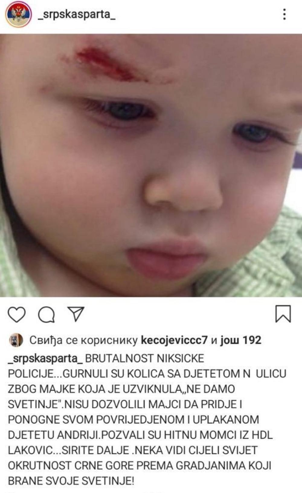Juče je društvene mreže preplavila slika deteta, kojej je navodno povrijeđeno tako što je policajac prevrnuo kolica u kojem se nalazilo nakon što je njegova majka uzviknula „Ne damo svetinje“, objavio je portal In4S.
