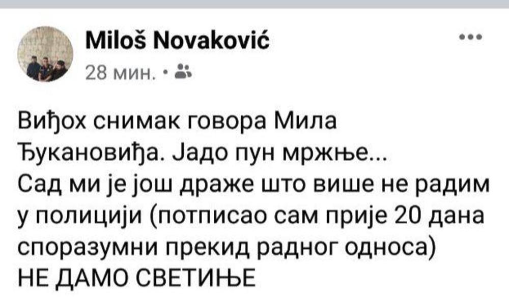 „Viđoh snimak govora Mila Đukanovića. Jado pun mržnje… Sad mi je još draže što više ne radim u policiji „potpisao sam prije 20 danas sporazumni prekid radnog odnosa). NE DAMO SVETINjE“, napisao je Novaković.